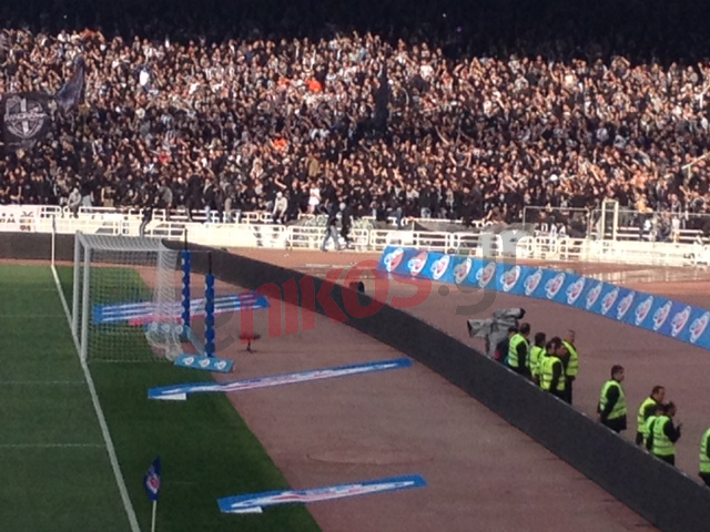Τεταμένη είναι η ατμόσφαιρά στις εξέδρες του ΟΑΚΑ καθώς οπαδοί του ΠΑΟΚ μπήκαν στον στίβο περιμετρικά του αγωνιστικού χώρου και επεχείρησαν να πλησιάσουν την εξέδρα των οπαδών του Παναθηναϊκού.