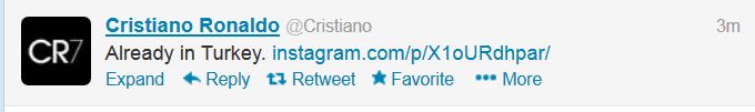 Η Ρεάλ έφτασε στην Τουρκία για το ματς με την Γαλατά Σαράι, αύριο Τρίτη για το τσάμπιονς λιγκ και ο Κριστιάνο Ρονάλντο ανεβάζει φωτογραφίες στο twitter.
