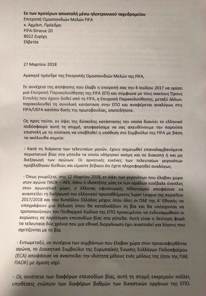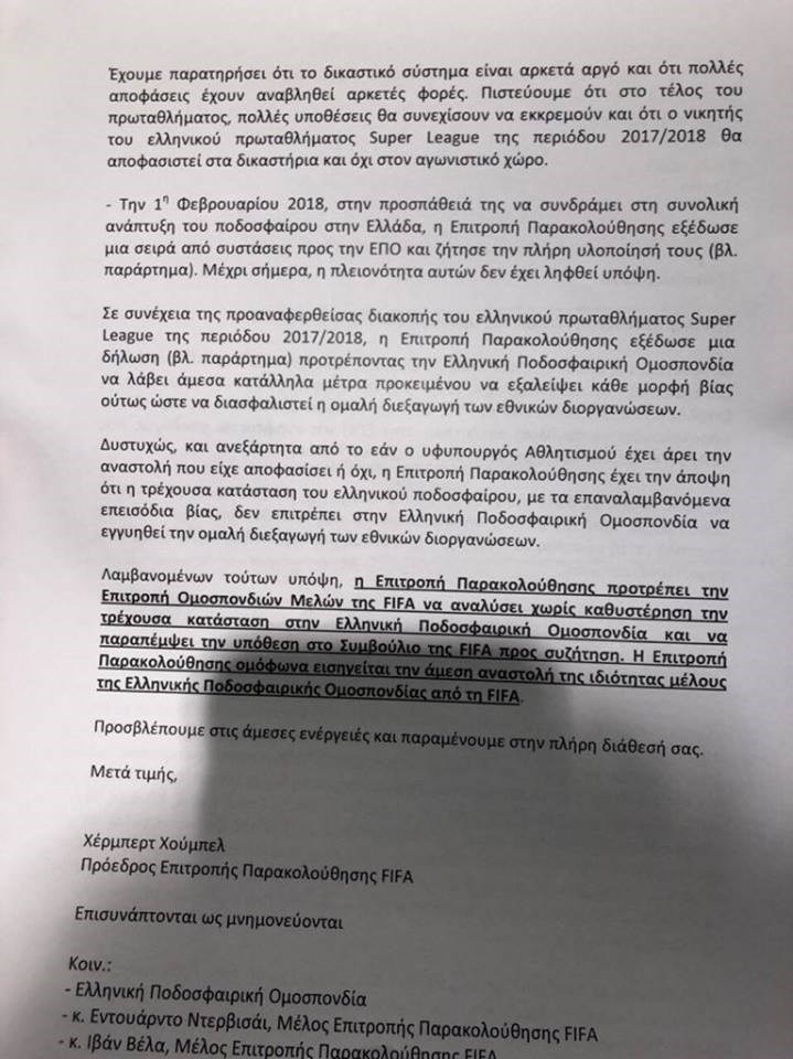 Ο Αυστριακός πρόεδρος της Επιτροπής Παρακολούθησης της Ομοσπονδίας, Χέρμπερτ Χούμπελ στην έκθεσή του προς τη FIFA, εισηγείται αποκλεισμό του ελληνικού ποδοσφαίρου από τις διεθνείς διοργανώσεις, χωρίς αναστολή ή περίοδο χάριτος και όχι μόνο για τους συλλόγους αλλά και για τις Εθνικές ομάδες.