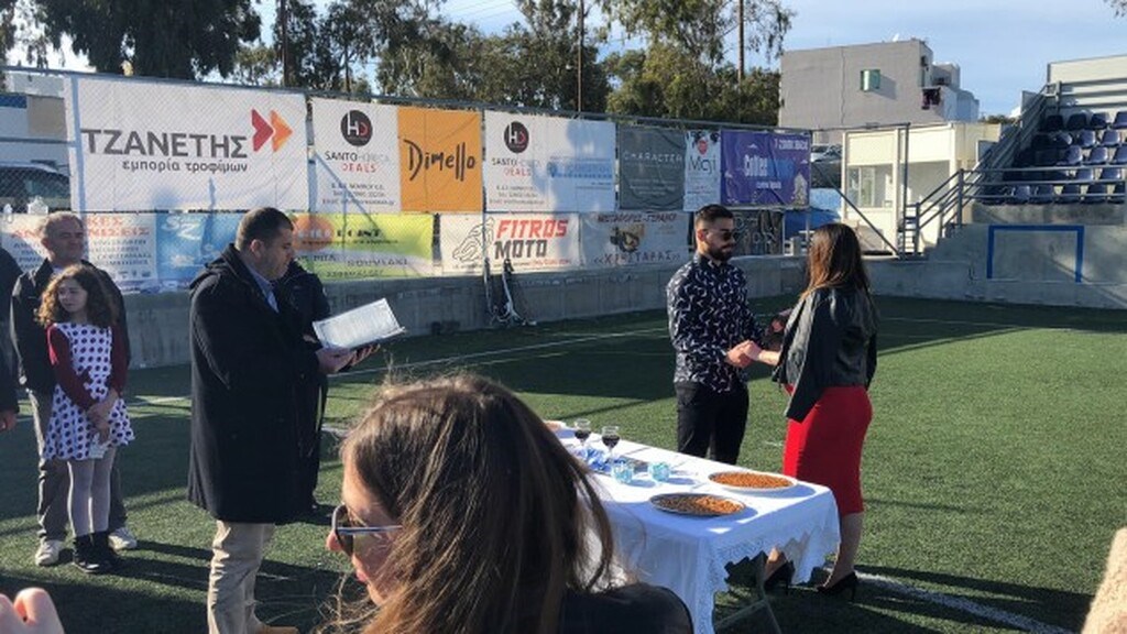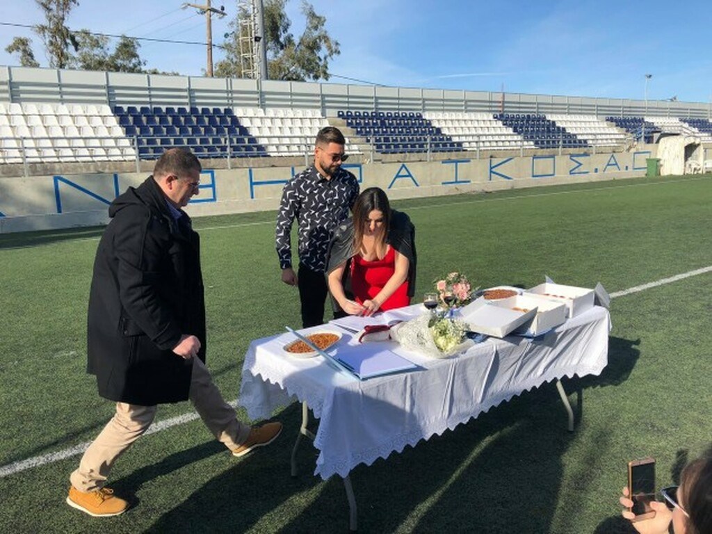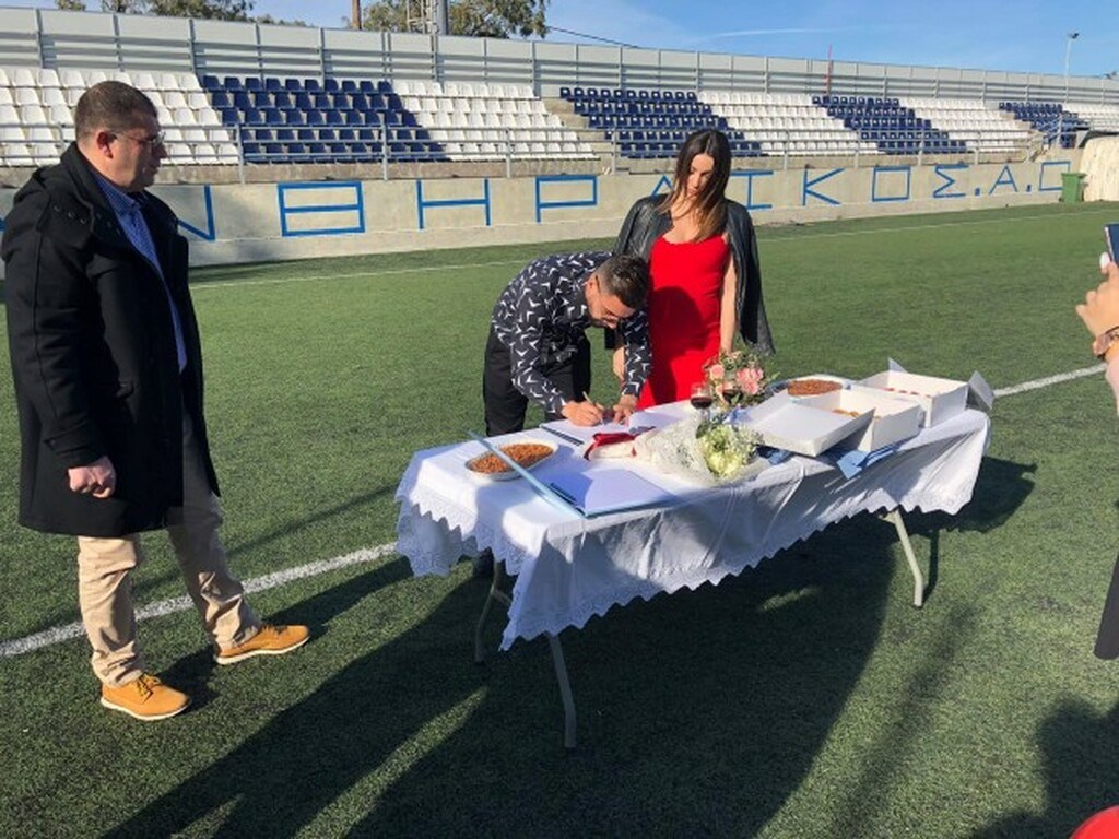Πιο συγκεκριμένα ο παίκτης της ομάδας της Σαντορίνης, Χρήστος Ντούμος, η οποία συμμετέχει στον 7ο όμιλο της Γ΄ Εθνικής πήρε την απόφαση, να παντρευτεί την εκλεκτή της καρδιάς του Άννα στο γήπεδο που χρησιμοποιεί ως έδρα της με τους συμπαίκτες του, το Δ.Σ., αλλά και το τεχνικό τιμ του κυκλαδίτικου συγκροτήματος να δίνουν το παρών στο μυστήριο.