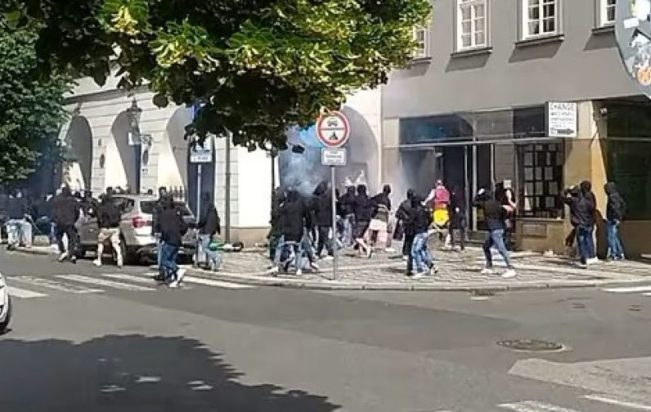 Ένα βίντεο στο Twitter δείχνει οπαδούς να ανάβουν φωτοβολίδες και να πετάνε τραπέζια στο μπαρ που βρίσκεται ακριβώς έξω από την πλατεία της Παλιάς Πόλης της Πράγας. Επίθεση δέχθηκε κι ένας αστυνομικός.