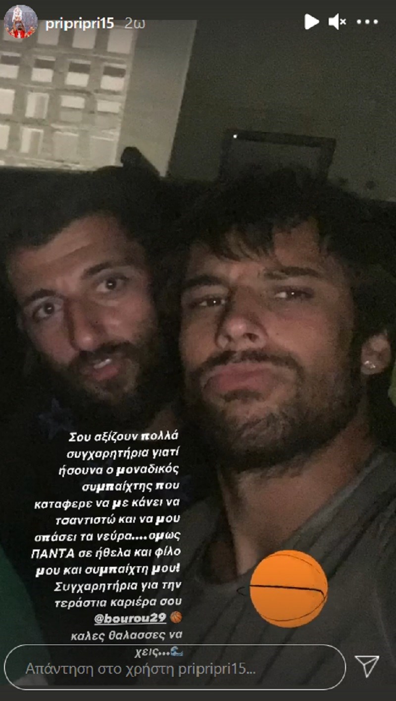 «Σου αξίζουν πολλά συγχαρητήρια γιατί ήσουν ο μοναδικός συμπαίκτης που κατάφερε να με κάνει να τσαντιστώ και να μου σπάσει τα νεύρα… Όμως, ΠΑΝΤΑ, σε ήθελα φίλο και συμπαίκτη μου! Συγχαρητήρια για την τεράστια καριέρα σου, καλές θάλασσες να ‘χεις…», ανέφερε ο 36χρονος φόργουορντ του Ολυμπιακού.