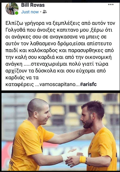 «Ελπίζω γρήγορα να ξεμπλέξεις από αυτόν τον Γολγοθά που άνοιξες καπιτάνο μου, ξέρω ότι οι ανάγκες σου σε ανάγκασαν να μπεις σε αυτόν τον λανθασμένο δρόμο, είσαι απίστευτο παιδί και καλόκαρδος και παρασύρθηκες από την καλή σου την καρδιά και από την οικονομική ανάγκη… στενοχωριέμαι πολύ γιατί τώρα αρχίζουν τα δύσκολα και σου εύχομαι από καρδιάς να τα καταφέρεις… vamoscapitano».