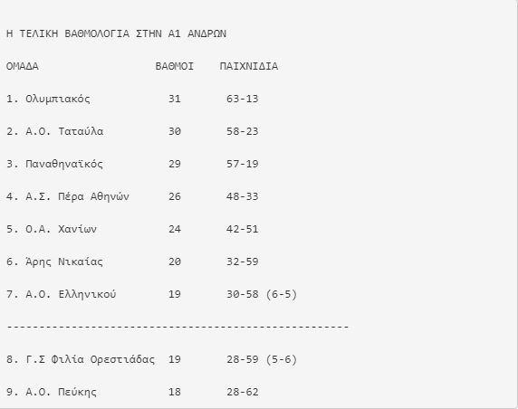 Η ΤΕΛΙΚΗ ΒΑΘΜΟΛΟΓΙΑ ΣΤΗΝ Α1 ΓΥΝΑΙΚΩΝ