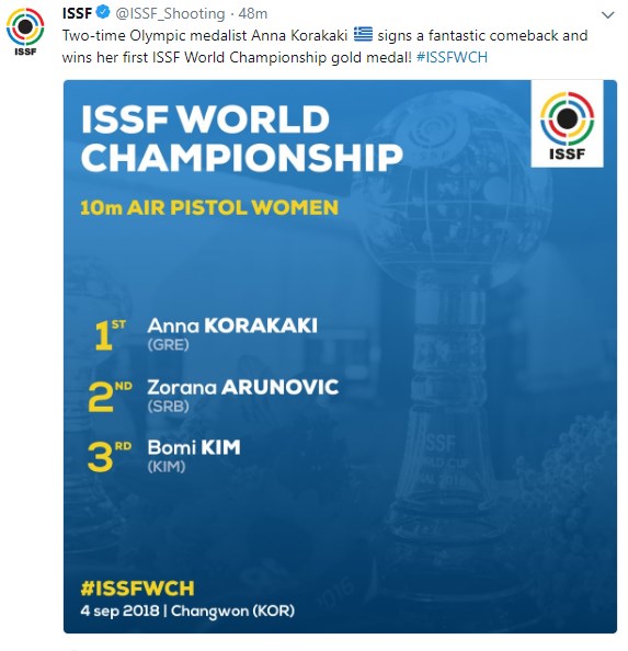 Παγκόσμια πρωταθλήτρια αναδείχθηκε η Άννα Κορακάκη, κερδίζοντας το χρυσό μετάλλιο στο αεροβόλο πιστόλι 10 μ. στο παγκόσμιο πρωτάθλημα σκοποβολής, που διεξάγεται στην Τσανγκγουόν της Ν. Κορέας.