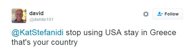 «Αυτή η σκύλα που κέρδισε είναι από το Στάνφορντ. Ίσως θα έπρεπε να μείνει στην Ελλάδα», έγραψε αρχικά ο Αμερικανός και λίγο αργότερα επανήλθε γράφοντας στο λογαριασμό της Κατερίνας Στεφανίδη «Σταμάτα να χρησιμοποιείς τις ΗΠΑ. Μείνε στην Ελλάδα, αυτή είναι η χώρα σου».