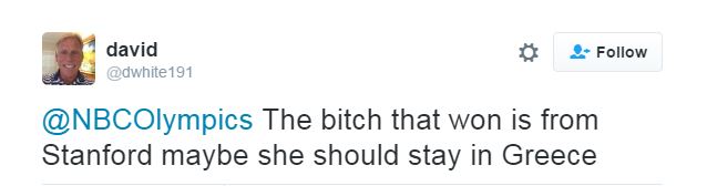 Το NBC στον λογαριασμό του στο μέσο κοινωνικής δικτύωσης αναφέρθηκε στην επιτυχία της Στεφανίδη ωστόσο ένας Αμερικανός από το Τέξας είχε διαφορετική άποψη για τη μεγάλη νίκη της Ελληνίδας πρωταθλήτριας και την εξέφρασε με άκρως ρατσιστικό τρόπο.