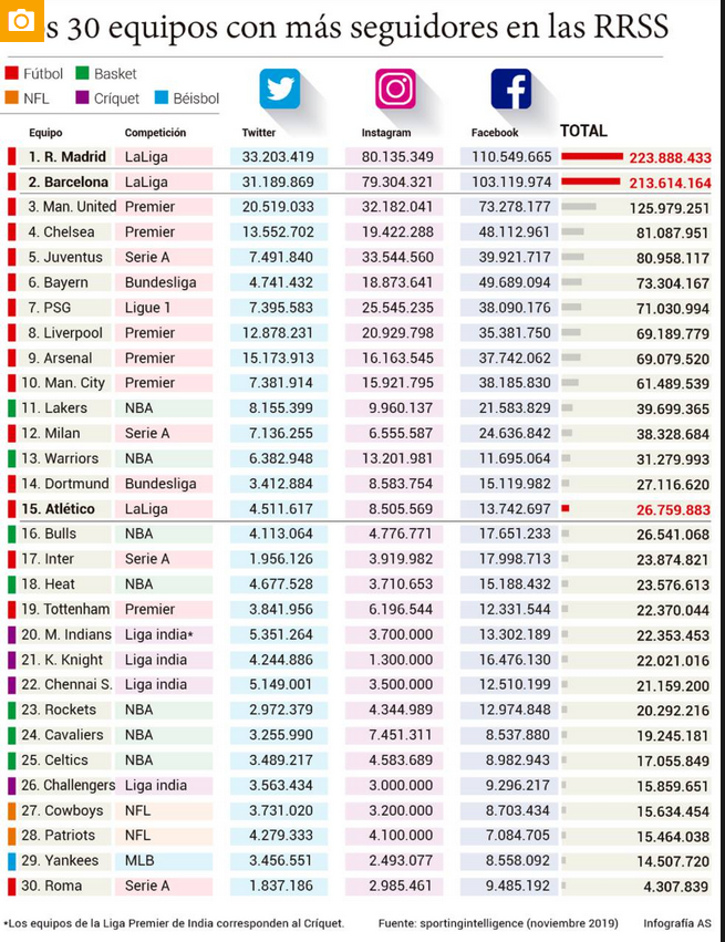 Η ομάδα της Μαδρίτης έχει συνολικά σε twitter, instagram και facebook 223.888.433 followers, μόλις 274.269 περισσότερους από τη 2η Μπαρτσελόνα που φτάνει τους 213.614.164.