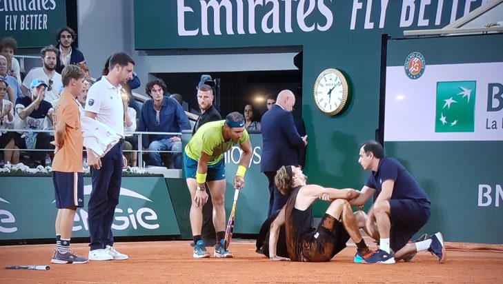 Λίγα λεπτά αργότερα, ο Αλεξάντερ Ζβέρεφ επέστρεψε με πατερίτσες στο κορτ και ανακοίνωσε ότι δεν μπορεί να συνεχίσει, με τον Ράφα Ναδάλ να προκρίνεται στον τελικό του γαλλικού Grand Slam.