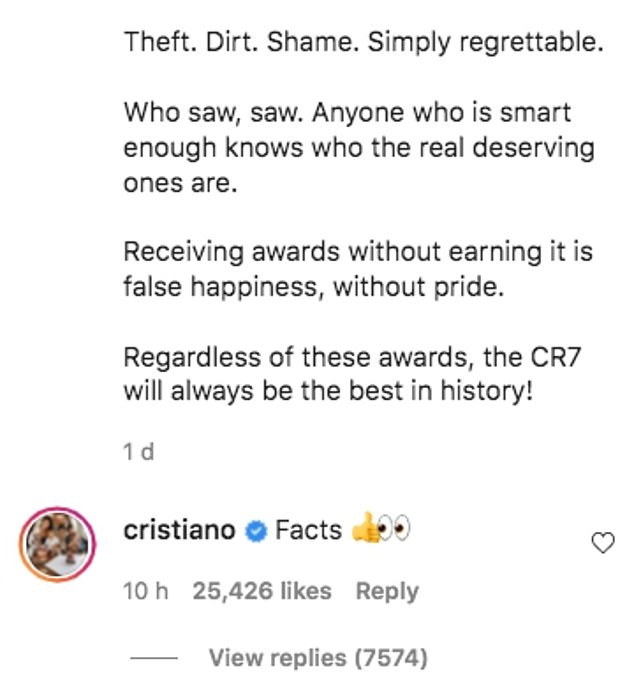 Ο Πορτογάλος άσος της Μάντσεστερ Γιουνάιτεντ, μάλιστα, σε ποστάρισμα σελίδας θαυμαστών του και σε ανάρτηση περί «κλοπής» κι άδικης απονομής στον Αργεντινό, εξαπέλυσε πρωτοφανή επίθεση κατά του Μέσι, σχολιάζοντας χαρακτηριστικά: «Γεγονότα»!