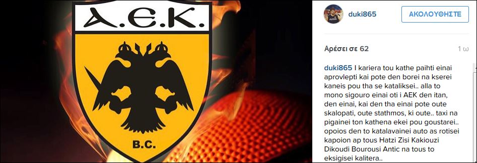 «Η καριέρα του κάθε παίκτη είναι απρόβλεπτη και ποτέ δε μπορεί να ξέρει κανείς πού θα καταλήξει, αλλά το μόνο σίγουρο είναι ότι η ΑΕΚ δεν ήταν, δεν είναι και δεν θα είναι ποτέ ούτε σκαλοπάτι, ούτε σταθμός, κι ούτε… ταξί να πηγαίνει τον καθένα εκεί που γουστάρει. Όποιος δεν το καταλαβαίνει ας ρωτήσει κάποιον από τους Χατζή, Ζήση, Κακιούζη, Ντικούδη, Μπουρούση, Άντιτς να του εξηγήσει καλύτερα», έγραψε στον προσωπικό του λογαριασμό στο Instagram ο άσος της «Ένωσης».