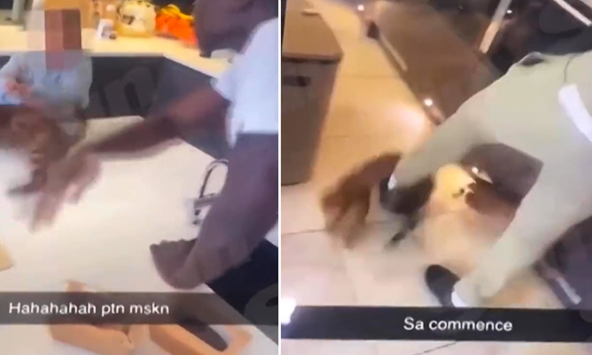 Κυνηγάει επίσης τη γάτα στην κουζίνα και στην τραπεζαρία μπροστά σε ένα παιδί, ενώ το άτομο που απαθανάτισε το βίντεο γελάει υστερικά.