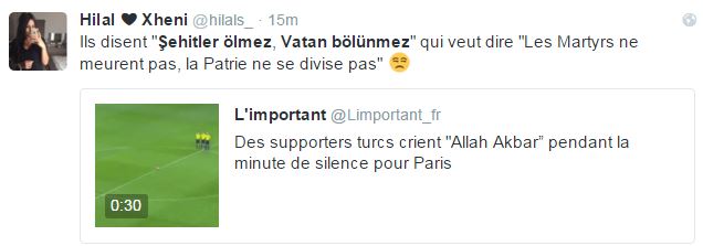 Μάλιστα, σύμφωνα με αναφορές χρηστών στο διαδίκτυο, ακούστηκε και ένα εθνικιστικό σύνθημα από μερίδα Τούρκων οπαδών, το «şehitler ölmez, vatan bölünmez», μαζί με το “Αλλάχου Άκμπαρ”, κατά τη διάρκεια του ενός λεπτού σιγής για τα θύματα των τρομοκρατικών επιθέσεων στο Παρίσι.
