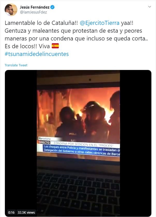 «Θλιβερό αυτό που συμβαίνει στην Καταλονία. Ο στρατός να επέμβει τώρα! Όχλος και κακοποιοί που διαδηλώνουν με αυτόν και ακόμη χειρότερο τρόπο για μία καταδίκη, που είναι εξάλλου και μικρή. Είναι τρελό. Ζήτω η Ισπανία!»