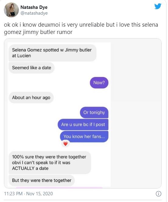 Τίτλους δημιουργεί και πάλι η Σελένα Γκόμεζ για την προσωπική της ζωή καθώς οι φήμες οργιάζουν ότι είναι ζευγάρι με τον αστέρα του NBA και των Miami Heat Τζίμι Μπάτλερ. Αν και όλα τα αθλητικά Μέσα σχολιάζουν το νέο ειδύλλιο του μπασκετμπολίστα με την popstar δεν υπάρχουν πουθενά φωτογραφίες που να το επιβεβαιώνουν. Ωστόσο, χρήστες του Twitter σχολίασαν ότι οι δυο τους είναι αλήθεια μαζί καθώς τους είδαν σε ραντεβού στο “Lucien” και αναφέρονται σ’ αυτούς σαν ζευγάρι. Πολλοί επιβεβαίωσαν τη μαρτυρία ενώ άλλοι χρήστες των social media αντέδρασαν στη φημολογία του ρομάντσου σχολιάζοντας ότι πρόκειται για περίεργο ζευγάρι. Ένας χρήστης ξεκίνησε τη διάδοση της είδησης ζητώντας από τους άλλους να εμπιστευτούν τα λόγια του. Σε άλλα μηνύματα λοιποί χρήστες σημείωσαν ότι δεν μπορούσαν να πουν ξεκάθαρα αν οι δύο διασημότητες της μουσικής και του αθλητισμού ήταν σε ραντεβού αλλά είναι σίγουρα ζευγάρι. Και ενώ οι θαυμαστές του Μπάτλερ εξέφραζαν την απορία τους για τη σχέση αυτή, οι φαν της Γκόμεζ χαρακτήρισαν τον αστέρα του NBA “άσχημο” με άλλους να αρνούνται να πιστέψουν ότι πρόκειται για πραγματική σχέση ή αν είναι απλή φήμη.