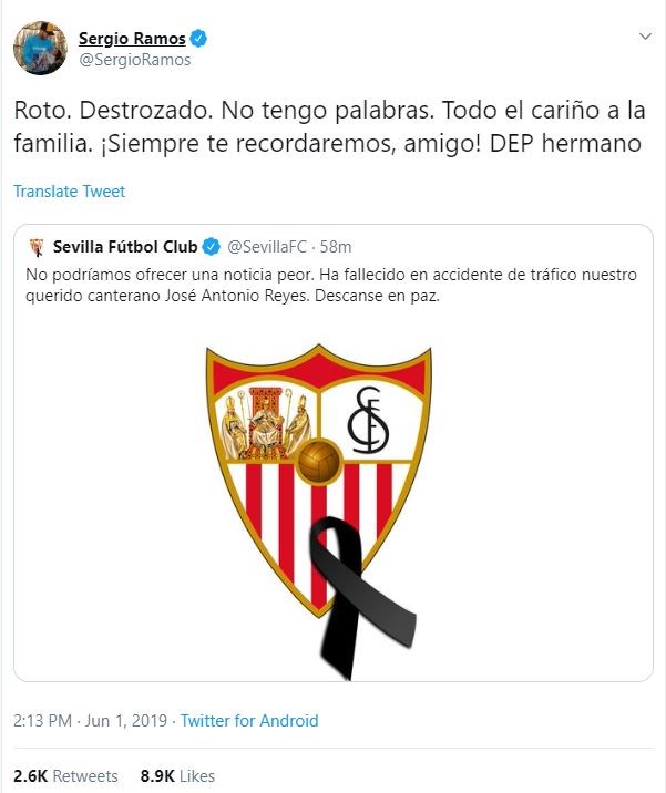 Η Σεβίλλη ανακοίνωσε τη δυσάρεστη είδηση και ο Σέρχιο Ράμος με ανάρτησή του στα social media εξέφρασε την απόλυτη θλίψη του για το τραγικό αυτό γεγονός.