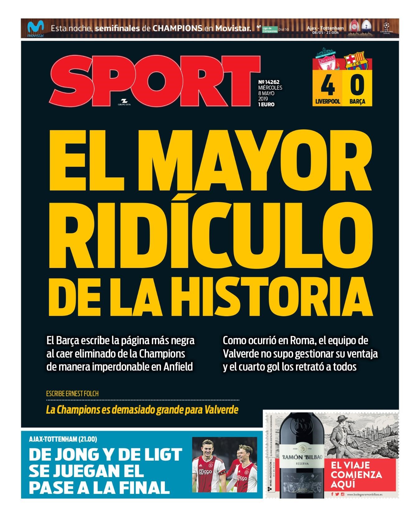 Επιλέγοντας μαύρο φόντο και με τεράστια γράμματα, η καταλανική εφημερίδα Sport γράφει «Η μεγαλύτερη ξεφτίλα στην ιστορία» για τον τραγικό αποκλεισμό της Μπαρτσελόνα από την Λίβερπουλ στα ημιτελικά του Champions League.«Η Μπάρτσα έγραψε μαύρη σελίδα με τον αποκλεισμό της με ασυγχώρητο τρόπο στο Άνφιλντ», γράφει λίγο πιο κάτω και δεξιά προσθέτει: «Όπως συνέβη στη Ρώμη, η ομάδα του Βαλβέρδε δεν ήξερε πώς να διαχειριστεί το πλεονέκτημά της». Παράλληλα, η καταλανική εφημερίδα επιρρίπτει ευθύνες και στον Ερνέστο Βαλβέρδε, υποστηρίζοντας πως ίσως είναι πολύ μεγάλη για τον Βάσκο προπονητή.«Οι πρωταθλητές είναι πολύ μεγάλοι για τον Βαλβέρδε», αναφέρει.