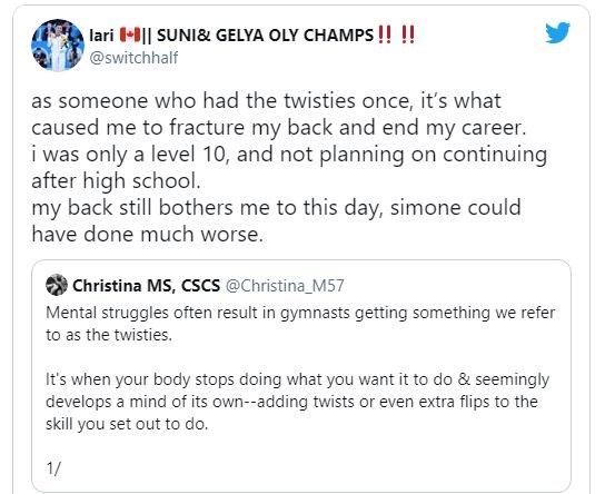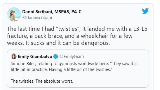 Πολλοί πρώην αλλά και νυν αθλητές της ενόργανης, αμέσως μετά τη δήλωση της Σιμόν για twisties εξέφρασαν την αλληλεγγύη τους και υπογράμμισαν πόσο σημαντικό είναι το ψυχικό αυτό φαινόμενο. Μία αθλήτρια έκανε λόγο για “φοβερά twisties” ενώ άλλοι μοιράστηκαν τις δικές τους δυσάρεστες εμπειρίες.