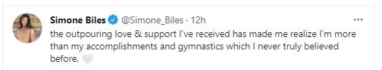 Από την πλευρά της, η 24χρονη αθλήτρια, ευχαρίστησε τους θαυμαστές της για τα ευγενικά λόγια τους τονίζοντας ότι η αγάπη τους και η στήριξή τους την έκαναν να συνειδητοποιήσει ότι αξίζει πολύ περισσότερο απ’ ό,τι τα μετάλλιά της.