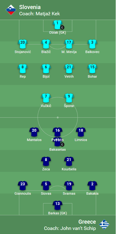 Η ενδεκάδα της Σλοβενίας στο 4-4-2 του Ματίας Κεκ: Όμπλακ, Μπάλκοβετς, Μεβλία, Μπλάζιτς, Στογιάνοβιτς, Μπόχαρ, Βέτριχ, Μπίγιολ, Ρεπ, Βούκσιτς, Σποράρ.