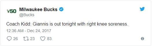 Ο Έλληνας σταρ αντιμετωπίζει πρόβλημα στο δεξί του γόνατο και ο προπονητής των «ελαφιών», Τζέισον Κιντ υποστήριξε πως δεν θα τον έχει στη διάθεση του για το αποψινό παιχνίδι. Δείτε το tweet των Μπακς:
