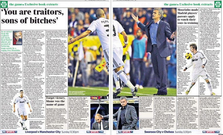 Άγριες… σκηνές από τα επεισόδια που είχε με παίκτες της Ρεάλ Μαδρίτης, κατά την διάρκεια της θητείας του στην «βασίλισσα», γίνονται γνωστές μέσω του βιβλίου «The Special One – The Dark Side of Jose Mourinho». Αποσπάσματα δημοσίευσαν οι «Times» και σύμφωνα με αυτά ο Πορτογάλος τεχνικός είχε άγριο ξέσπασμα κατά των παικτών, μετά την ισοπαλία (1-1) με την Μπαρτσελόνα το 2011 στο «Καμπ Νόου», φτάνοντας στο σημείο να τους αποκαλέσει «π…ας γιους», ενώ έκανε λόγο και για… «ύπουλη ομάδα»!