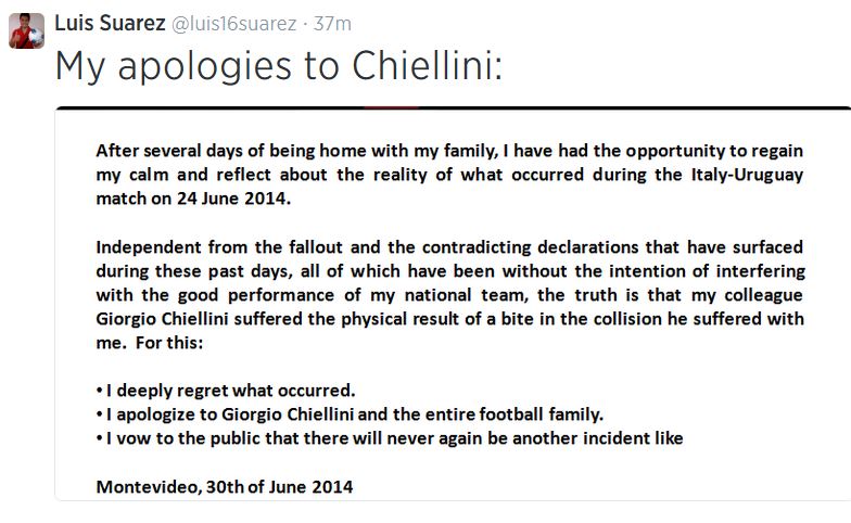 “Μετά από αρκετές μέρες που πέρασα στο σπίτι μου με την οικογένειά μου, είχα την ευκαιρία να ανακτήσω την ψυχραιμία μου και να σκεφτώ όσα έγιναν στο ματς Ιταλία – Ουρουγουάη. Ανεξάρτητα από τις κριτικές και τις αλληλοσυγκρουόμενες δηλώσεις που είδαν το φως της δημοσιότητας αυτές της μέρες, όλες εκ των οποίων έγιναν χωρίς καμία πρόθεση παρέμβασης στην καλή εμφάνιση της εθνικής μου ομάδας, η αλήθεια είναι ότι ο συνάδερφός μου Κιελίνι υπέστη τις σωματικές επιπτώσεις του δαγκώματος μετά από σύγκρουση που είχε μαζί μου.