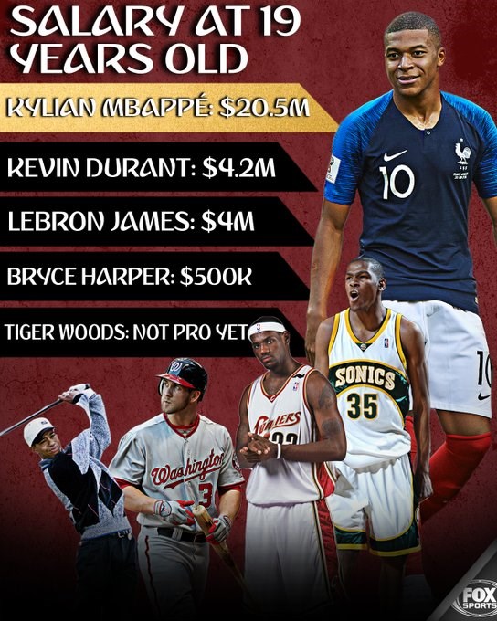 Ενώ, λοιπόν, ο Εμπαπέ λαμβάνει 20,5 εκατ. δολάρια τον χρόνο, στην ίδια ηλικία ο Κέβιν Ντουράντ έπαιρνε 4,2 εκατομμύρια και ο ΛεΜπρόν Τζέιμς 4 εκατομμύρια, ενώ ο Τάιγκερ Γουντς δεν ήταν καν επαγγελματίας.
