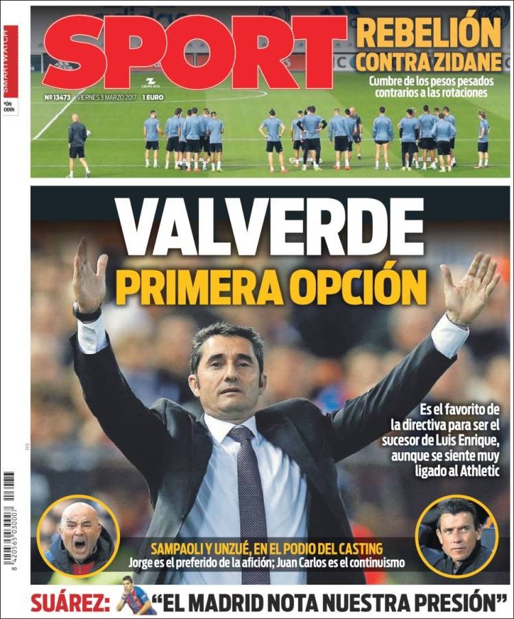 Μετά την απόφαση του Λουίς Ενρίκε (στη συνέντευξη Τύπου ύστερα από το 6-1 επί της Χιχόν) το βράδυ της Τετάρτης να γνωστοποιήσει πως δεν θα ανανεώσει τη συνεργασία του με την Μπαρτσελόνα μετά το καλοκαίρι, όλοι αναζητούν το νέο αφεντικό των αποδυτηρίων της “Μπάρτσα” τη νέα σεζόν, με την κούρσα της διαδοχής να περιλαμβάνει αρκετά ονόματα.Μεταξύ αυτών και ο διάσημος στο ελληνικό φίλαθλο κοινό από το διπλό πέρασμά του από τον Ολυμπιακό, Ερνέστο Βαλβέρδε, ο οποίος, μάλιστα, όσο περνούν οι ημέρες τόσο βρίσκεται όλο και πιο κοντά στον πάγκο των “μπλαουγκράνα”. Η μαδριλένικη “Marca” είχε εξηγήσει την Πέμπτη-μέσα από μία σειρά λόγων που παρέθεσε πως ο τεχνικός της Αθλέτικ Μπιλμπάο είναι το φαβορί για να πάρει το χρίσμα ενώ μία ημέρα αργότερα έρχονται και οι Καταλανοί να επιβεβαιώσουν αυτή την εκδοχή.Το σημερινό (3/3) πρωτοσέλιδο της καταλανικής αθλητικής εφημερίδας “Sport” είναι χαρακτηριστικό, καθώς έχει μεγάλη φωτογραφία του “Τσινγκούρι” και από πάνω τον τίτλο: “Βαλβέρδε η πρώτη επιλογή”. Με την εφημερίδα να συμπληρώνει πως “είναι η Νο 1 επιλογή της διοίκησης για να διαδεχτεί τον Λουίς Ενρίκε, αν και είναι πολύ δεμένος με την Αθλέτικ”.Όσον αφορά στους άλλους υποψηφίους που έχουν και αυτοί αρκετές πιθανότητες, η εφημερίδα αναφέρει: “Σαμπαόλι και Ουνθούε συμπληρώνουν το πόντιουμ. Ο Χόρχε είναι ο αγαπημένος του κόσμου ενώ ο Χουάν Κάρλος συμβολίζει τη συνέχεια ως βοηθός του Λουίς Ενρίκε”.