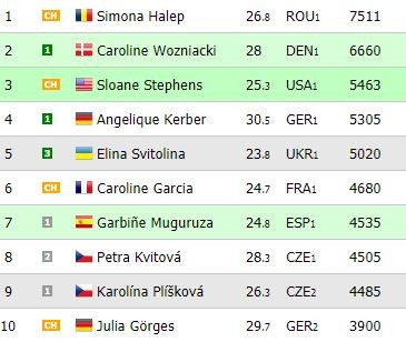 Όσον αφορά στις γυναίκες, η Μαρία Σάκκαρη είχε απώλεια βαθμών κι έτσι από το Νο.46 έπεσε στο Νο.49 της παγκόσμιας κατάταξης με 1.151 βαθμούς. Στην κορυφή παρέμεινε η Σιμόνα Χάλεπ από τη Ρουμανία.