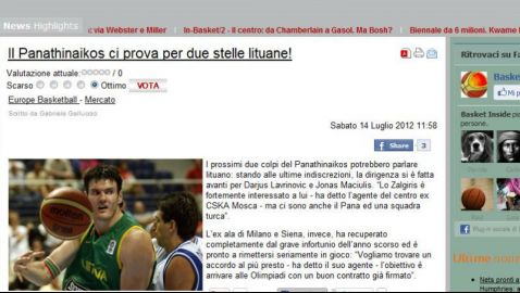 Πιθανό είναι το ενδεχόμενο να αποκτήσει παρέα ο Σαρούνας Γιασικεβίτσιους, όπως αναφέρουν τα Μέσα της πατρίδας του. Η ιστοσελίδα basketinside.com, υποστηρίζει ότι Λαβρίνοβιτς και Ματσιούλις ενδιαφέρουν τον Παναθηναϊκό κι όσον αφορά μάλιστα τον πρώτο έχει ήδη πρόταση από το τριφύλλι στα χέρια του (σ.σ. ο δεύτερος υπέγραψε πέρυσι με οψιόν και για τη νέα χρονιά).