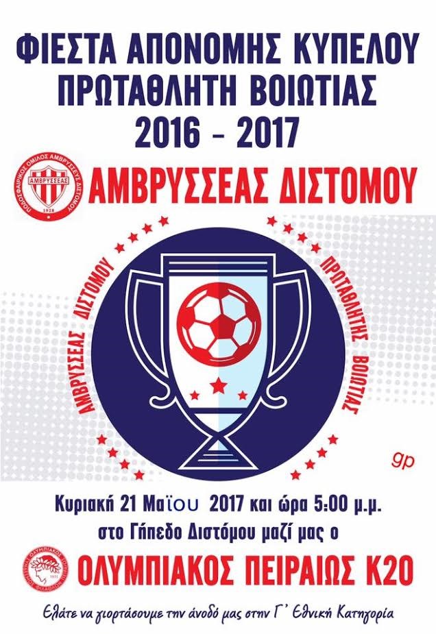 Φιέστα απονομής Κυπέλλου Πρωταθλητή Βοιωτίας για τον Αμβρυσσέα την Κυριακή 21 Μαΐου, που υποδέχεται στο Δίστομο τον Πρωταθλητή Ολυμπιακό Πειραιώς της Κ-20, για να γιορταστεί η άνοδος της ομάδας του Μαρτυρικού Διστόμου στην Γ’ Εθνική.Η τελετή απονομής του Κυπέλλου από την ηγεσία της Ε.Π.Σ. Βοιωτίας, θα γίνει στο Δημοτικό Γήπεδο Διστόμου στις 5 μ.μ. και θα ακολουθήσει ο ποδοσφαιρικός αγώνας με τους «20άρηδες» του Ολυμπιακού Πειραιά, που ανακηρύχτηκαν Πρωταθλητές για 3η σερί χρονιά και για 5η στο Πρωτάθλημα της Super League. Προπονητής της ομάδας είναι για 3η συνεχόμενη σεζόν ο Βασίλης Βούζας, και επί των ημερών του παίκτες των Νέων πέρασαν και έπαιξαν στην επαγγελματική Ομάδα!Η ανταπόκριση των Νέων του Ολυμπιακού να συμμετάσχει στην φιέστα του Πρωταθλητή Βοιωτίας, αποτελεί τιμή όχι μόνο για την ιστορική ομάδα του Διστόμου -ιδρύθηκε το 1928- αλλά και για όλο το Βοιωτικό Ποδόσφαιρο, παίκτες και παράγοντες!