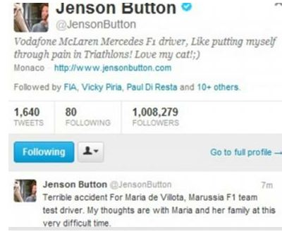 Μάχη για τη ζωή της, δίνει η Ισπανίδα πιλότος δοκιμών Μαρία Ντε Βιγιότα, της ομάδας Marussia, της Φόρμουλα 1. Νοσηλεύεται με σοβαρά τραύματα στο νοσοκομείο Addenbrooke. Η Ισπανίδα πιλότος δοκίμαζε στην πίστα του Duxford στο Cambridgeshire το νέο αεροδυναμικό πακέτο που σκοπεύει να χρησιμοποιήσει η ομάδα στο ερχόμενο Γκραν Πρι στο Σίλβερστοουν, όταν έπεσε με μεγάλη ταχύτητα πάνω στη ράμπα σταματημένου φορτηγού που χρησιμοποιείται για να μεταφέρει το μονοθέσιο.Αυτόπτες μάρτυρες αναφέρουν ότι πριν τη σύγκρουση, η Ντε Βιγιότα είχε μπλοκάρει τα πίσω ελαστικά της, χάνοντας τον έλεγχο του μονοθέσιου το οποίο είχε αναπτύξει απότομα ταχύτητα.Στο πλευρό της Μαρίας ντε Βιγιότα βρίσκεται ο κόσμος του μηχανοκίνητου αθλητισμού. Ο Τζένσον Μπάτον, πιλότος της McLaren, πληροφορήθηκε το πολύ σοβαρό ατύχημα της πιλότου της Marussia και μέσω του προσωπικού του λογαριασμού στο twitter έστειλε τις ευχές του και την υποστήριξη του στην οικογένεια της 32χρονης Ισπανίδας. Οι σκέψεις μου είναι μαζί της και με την οικογένεια της, αυτές τις δύσκολες στιγμές», δήλωσε ο Βρετανός πιλότος.