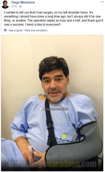 «Θέλω να σας πω ότι σήμερα υποβλήθηκα σε επέμβαση στον αριστερό ώμο. Είναι κάτι που έπρεπε να είχα κάνει εδώ και καιρό, όμως πάντα το ανέβαλα για τον έναν ή τον άλλον λόγο. Η εγχείρηση διήρκεσε 1,5 ώρα και δόξα τω Θεώ ήταν επιτυχής. Φιλιά σε όλους» έγραψε ο Ντιέγκο Μαραντόνα στο Facebook.