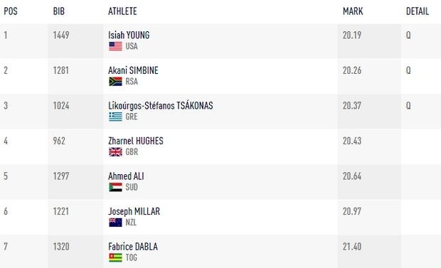 Πρώτος στη σειρά του ήταν ο Ισάϊα Γιάνγκ από τις ΗΠΑ με 20.19 και δεύτερος ο Ακάνι Σιμπίνε από τη Νότια Αφρική με 20.26.