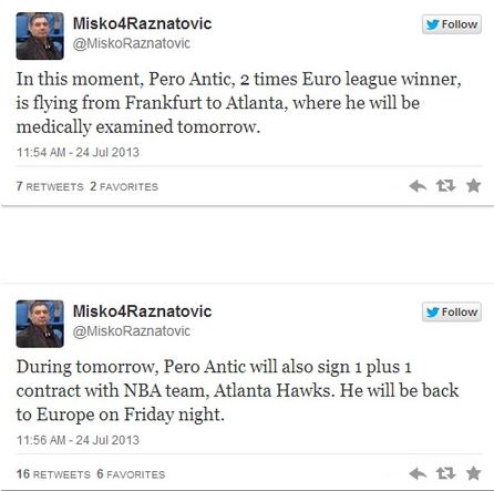 “Αυτή τη στιγμή, ο Πέρο Άντιτς, δύο φορές νικητής της Ευρωλίγκας, πετάει από την Φρανκφούρτη για την Ατλάντα, όπου αύριο θα εξεταστεί ιατρικά. Κατά τη διάρκεια της αυριανής ημέρας, θα υπογράψει επίσης συμβόλαιο 1+1 χρόνων με την ομάδα του ΝΒΑ, Ατλάντα Χοκς. Θα επιστρέψει στην Ευρώπη την Παρασκευή το βράδυ”