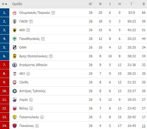 Πανιώνιος – ΑΕΚ 1-1 Αναλυτικά η βαθμολογία του πρωταθλήματος: