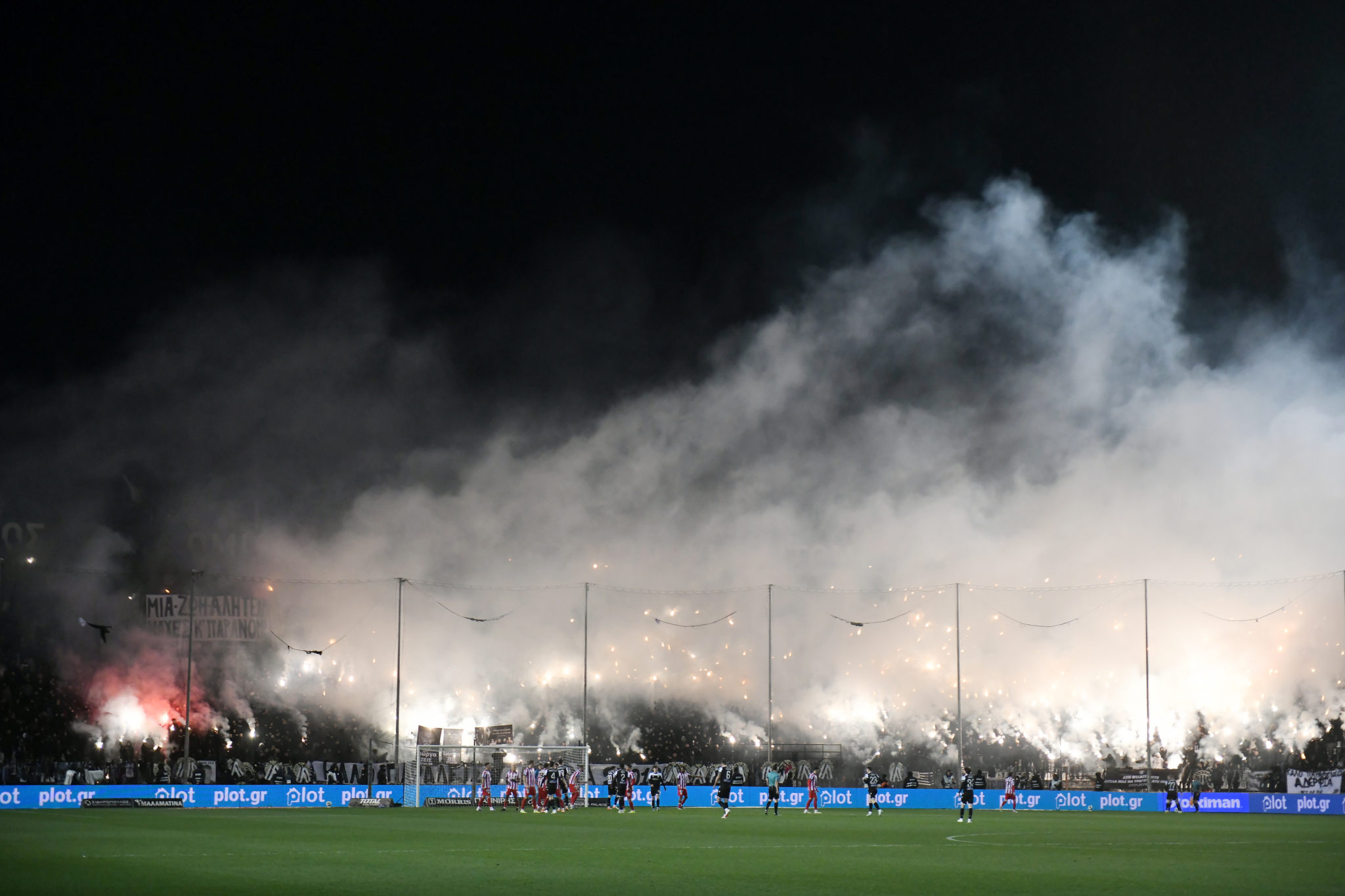 Αμέσως μετά τη σέντρα, το γήπεδο φωτίστηκε ολόκληρο από τους εκατοντάδες πυρσούς.