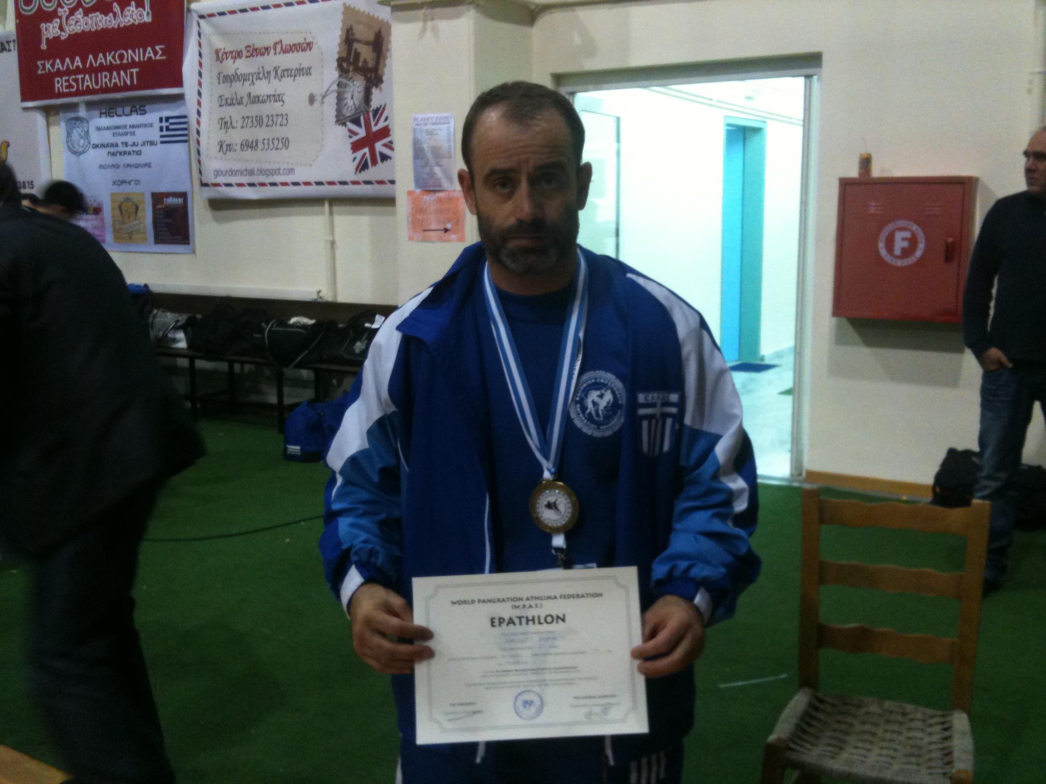 Ο Τρικαλινός πρωταθλητής έλαβε μέρος στην κατηγορία των βετεράνων στο μεγαλύτερο διαχρονικά αθλητικό γεγονός για το Παγκράτιο που έγινε πριν λίγες μέρες στη Σπάρτη (σ.σ. το Παγκράτιον ήταν ένα αγώνισμα των αρχαίων Ελλήνων, ένας συνδυασμός πάλης και πυγμαχίας).
