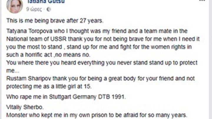 Σε μια συγκλονιστική ανάρτηση προχώρησε σήμερα η χρυσή Ολυμπιονίκης της Βαρκελώνης Τατιάνα Γκούτσου. Η πρωταθλήτρια της γυμναστικής που αγωνίστηκε με τα χρώματα της πρώην Σοβιετικής Ένωσης στους Ολυμπιακούς Αγώνες της Ισπανίας, ανακοίνωσε στο facebook ότι ο θρυλικός Βίταλι Σέρμπο την είχε βιάσει το 1991 σε ηλικία μόλις 15 χρονών. Όπως είναι φυσικό η ανακοίνωσή της 27 χρόνια μετά αναμένεται να προκαλέσει μεγάλο ντόρο…