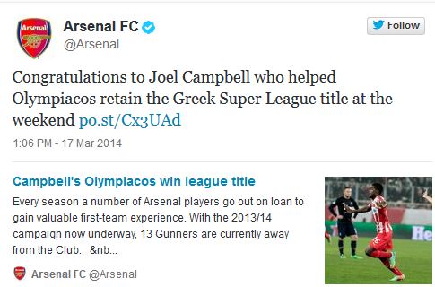 «Συγχαρητήρια στον Τζόελ Κάμπελ, ο οποίος το σαββατοκύριακο βοήθησε τον Ολυμπιακό να διατηρήσει τον τίτλο του πρωταθλητή στην Ελλάδα», έγραψαν οι Λονδρέζοι.