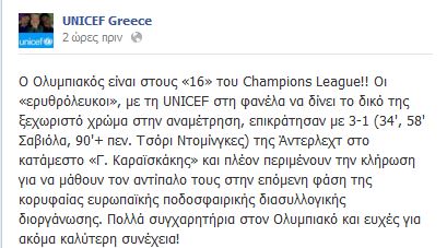 Τα συγχαρητήριά της στον Ολυμπιακό για την πρόκριση στους «16» του Champions League έδωσε η Unicef, με μήνυμα που ανάρτησε στον προσωπικό της λογαριασμό στο Facebook.