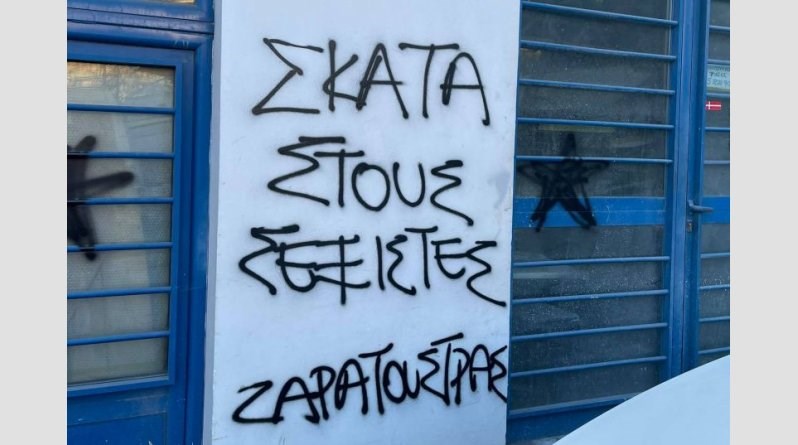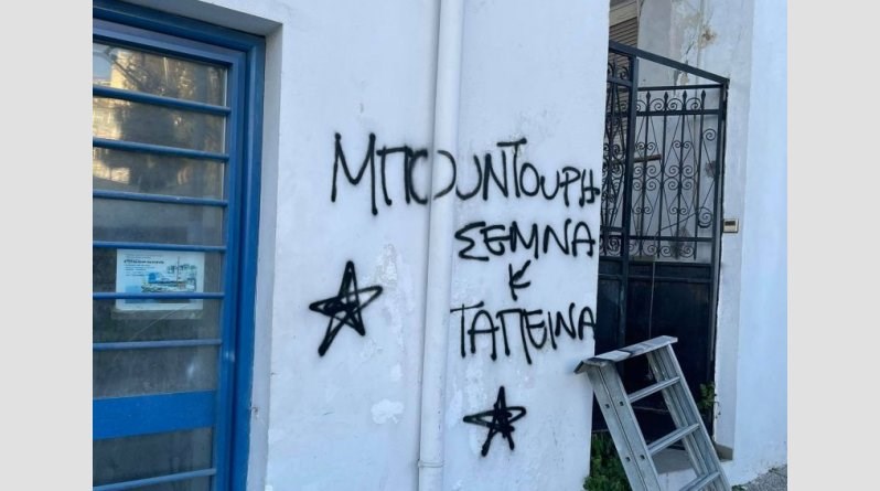Συνθήματα στους τοίχους του μαγαζιού που διατηρεί στο Μικρολίμανο ο Τάσος Μπουντούρης έγραψαν άγνωστοι τα ξημερώματα της Τρίτης.