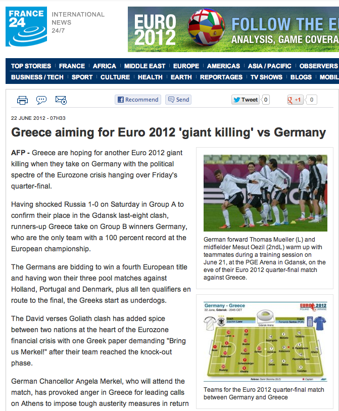France 24: “Η Ελλάδα στοχεύει στο Euro 2012 «δολοφονία γίγαντα» εναντίον της Γερμανίας”