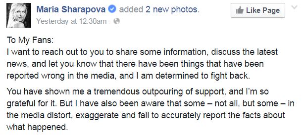 Η Ρωσίδα αθλήτρια του τένις που παραδέχθηκε πριν από λίγες μέρες δημοσίως πως έκανε χρήση της απαγορευμένης ουσίας, «meldonium», με ανάρτησή της, στο Facebook, χαρακτήρισε τις αναφορές των δημοσιογράφων ως «διαστρέβλωση των πραγματικών της ανακοινώσεων» .