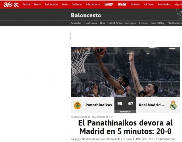 H AS αναφέρει πως «ο Παναθηναϊκός καταβρόχθισε τη Ρεάλ μέσα σε 5 λεπτά», κάνοντας ειδική αναφορά στο 20-0 του πρώτου 5λεπτου.