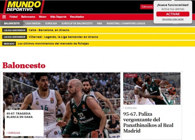 Η Mundo Deportivo, τέλος, έκανε λόγο για «Λευκή καταιγίδα στην Αθήνα», με αφορμή τη συντριβή της Ρεάλ Μαδρίτης από τον Παναθηναϊκό στο κλειστό του ΟΑΚΑ.