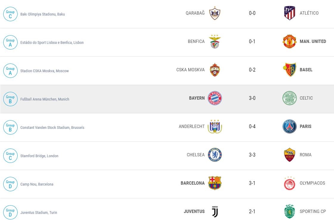 Με πολλά γκολ ολοκληρώθηκε η τρίτη αγωνιστική των ομίλων του Τσάμπιονς Λιγκ. Οι Μπαρτσελόνα, Παρί Σαιν Ζερμαίν και Μπάγερν επικράτησαν εύκολα των αντιπάλων τους. Η Γιουβέντους νίκησε δύσκολα την Σπόρτινγκ με 2-1, η Μάντσεστερ Γιουνάιτεντ του Μουρίνιο νίκησε με 1-0 την Μπενφίκα στην Λισαβώνα, ενώ η Τσέλσι κατάφερε να ισοφαρίσει την Ρόμα στο 75′, εμποδίζοντάς την να πετύχει μια μεγάλη νίκη στο Στάμφορντ Μπρίτζ.