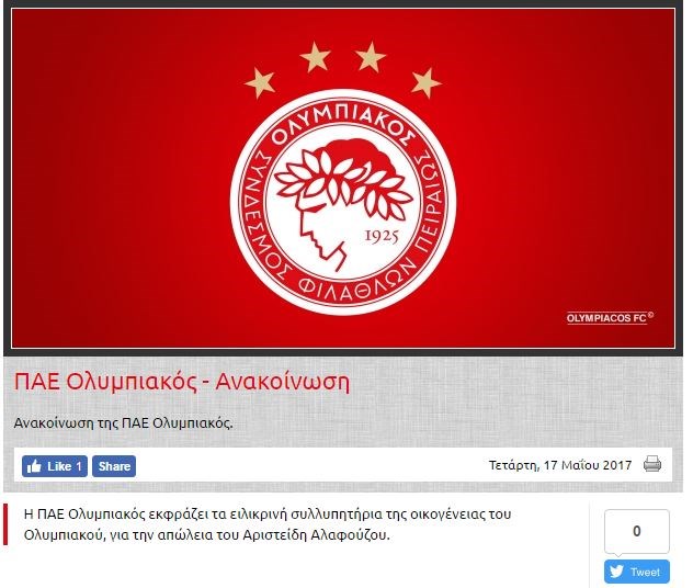 Τα συλλυπητήρια της ΠΑΕ Ολυμπιακός για τον Αριστείδη Αλαφούζο