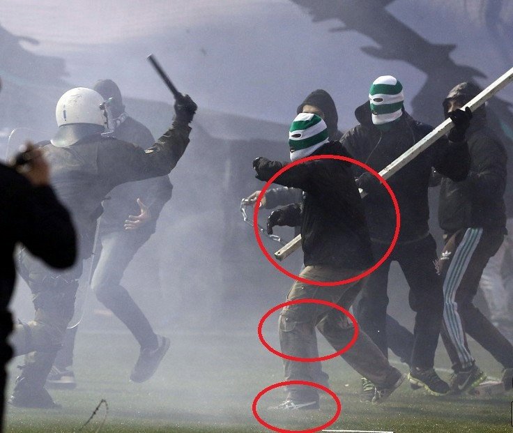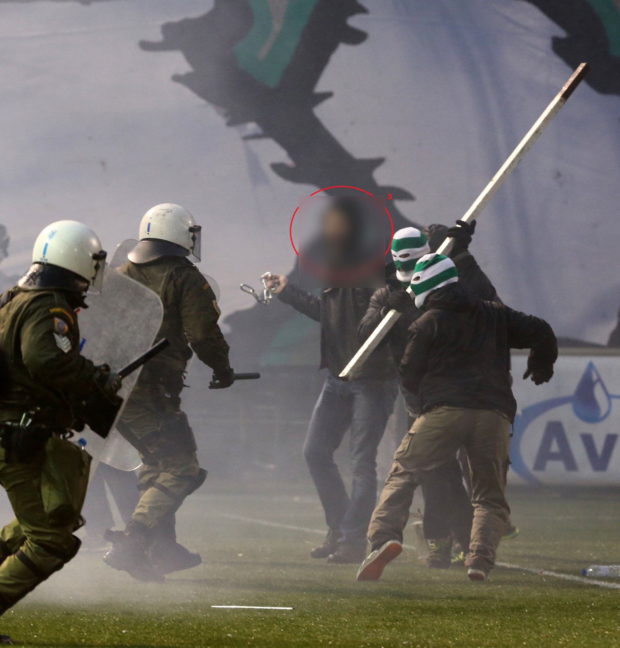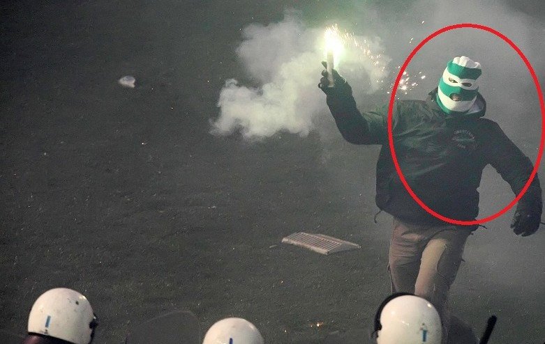 Πρόκειται για έναν 36χρονο, ο οποίος είχε εισέλθει στον αγωνιστικό χώρο πριν την έναρξη του αγώνα κρατώντας στο δεξί του χέρι μεταλλική αλυσίδα και έναν 26χρονο, ο οποίος επίσης είχε εισέλθει στον αγωνιστικό χώρο και είχε καλυμμένα πλήρως τα χαρακτηριστικά του προσώπου του με κουκούλα τύπου full face χρώματος πράσινου λευκού (ριγέ) και κρατούσε στο δεξί του χέρι φωτοβολίδα.